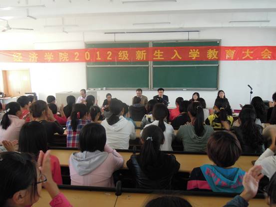 9月28日下午13:30,我院在圣井校区敏行楼B5201教室隆重召开2012级新生入学教育大会。我院院长董长瑞、党总支书记吴红文,副院长于淑波、王传荣、杨丽和副处级组织员刘波出席大会。院学工办主任兼团总支书记周新秀、就业办主任兼党总支秘书李冰封、正科级辅导员付雯、学生辅导员及2012级全体新生参加大会。大会由刘波主持。