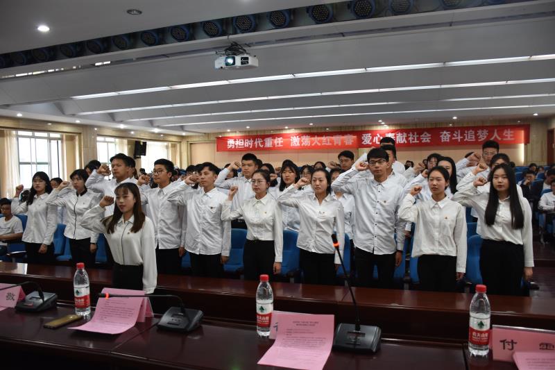 太阳成城集团tyc234cc“关爱小屋”青年志愿者临时团支部全体团员起立,面向团旗重温入团誓词。