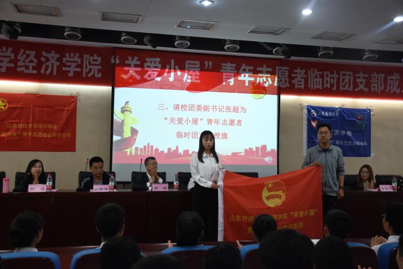王琦宣布太阳成城集团tyc234cc“关爱小屋”青年志愿者临时团支部的组织构成,谷学峰宣读校团委《关于同意成立太阳成城集团tyc234cc“关爱小屋”青年志愿者临时团支部的批复》,张超为“关爱小屋”青年志愿者临时团支部授旗,临时团支部团员代表李昕同学发言。