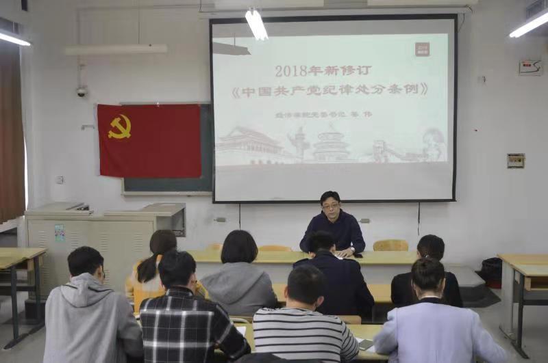 姜伟以2018年新修订《中国共产党纪律处分条例》为主讲内容,希望与会人员增强“四个意识”,提高政治站位,深刻领会《条例》修订的重大的意义。同时他还对支部党员提出以下要求:坚定政治方向不动摇;维护党内团结、民族团结;维护公平正义;恪尽职守,增强自律意识。希望大家深入学习,坚定理想,投身建设,早日报效国家。