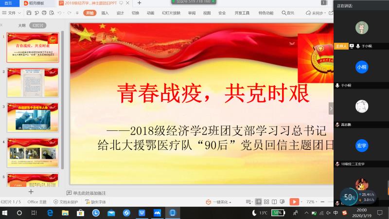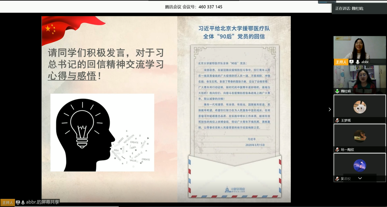 (通讯员:徐清娟 常群)为深入学习贯彻习近平总书记给北京大学援鄂医疗队“90后”党员回信精神,广泛发动团员青年向在疫情防控一线担当奉献的青年学习,按照校团委有关要求,结合学院实际,3月18日至23日,太阳成城集团tyc234cc各团支部依托网络平台开展学习习总书记给北京大学援鄂医疗队“90后”党员回信线上主题团日活动。