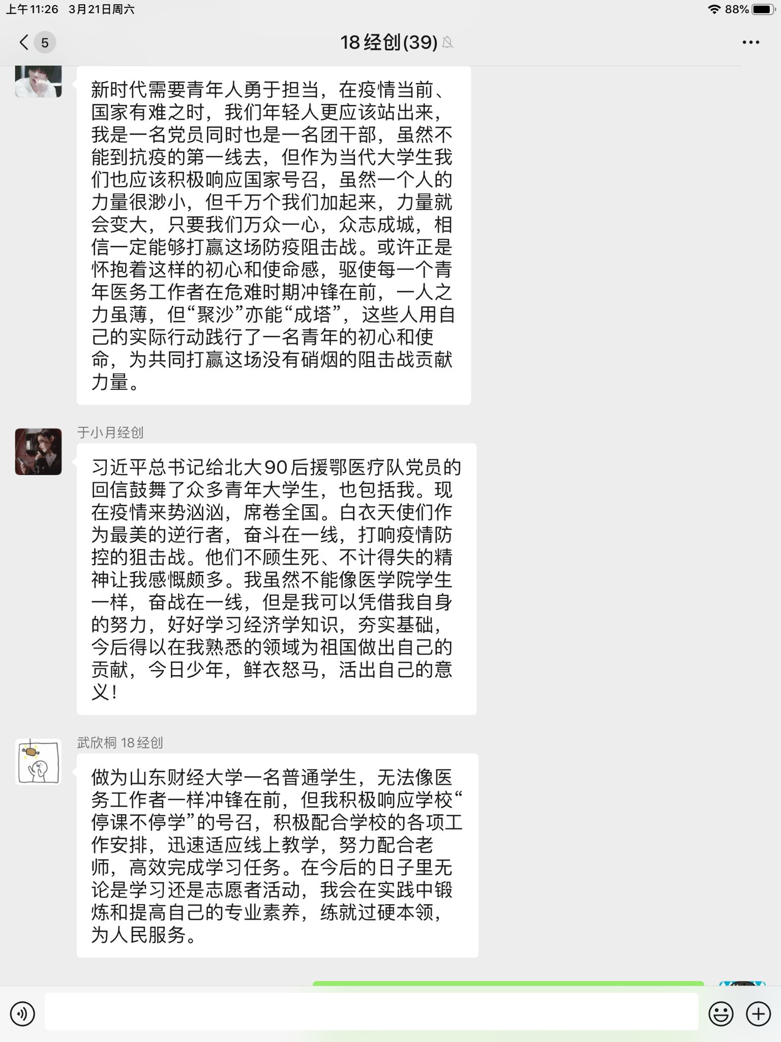 各团支部以“青春战疫,共克时艰”“青春抗疫,从我做起”“致敬抗疫英雄,让青春在战‘疫’中闪光”“众志成城同抗疫,青春聚力勇担当”“凝聚青春正能量,同心抗疫担使命”“致敬逆行者,共筑青春抗疫长城”等为主题,形式新颖,内容丰富多彩:带领团员青年认真学习领会习近平总书记此次回信精神,号召广大团员青年争做不惧风雨、勇挑重担的新时代青年;观看各行各业抗疫英雄的事迹视频、组织线上诗朗诵、分享身边的抗疫英雄事迹;手绘祝福语、录制短视频、线上同唱一首红歌,为武汉加油,为中国加油。各团支部还组织团员在团支部微信群、朋友圈等交流分享学习心得,广大青年纷纷表示将积极向抗疫英雄学习其家国情怀、担当精神、仁心大爱和奉献品德,努力将学习成果转化为勇于担当、甘于奉献、勤于进取的行动。