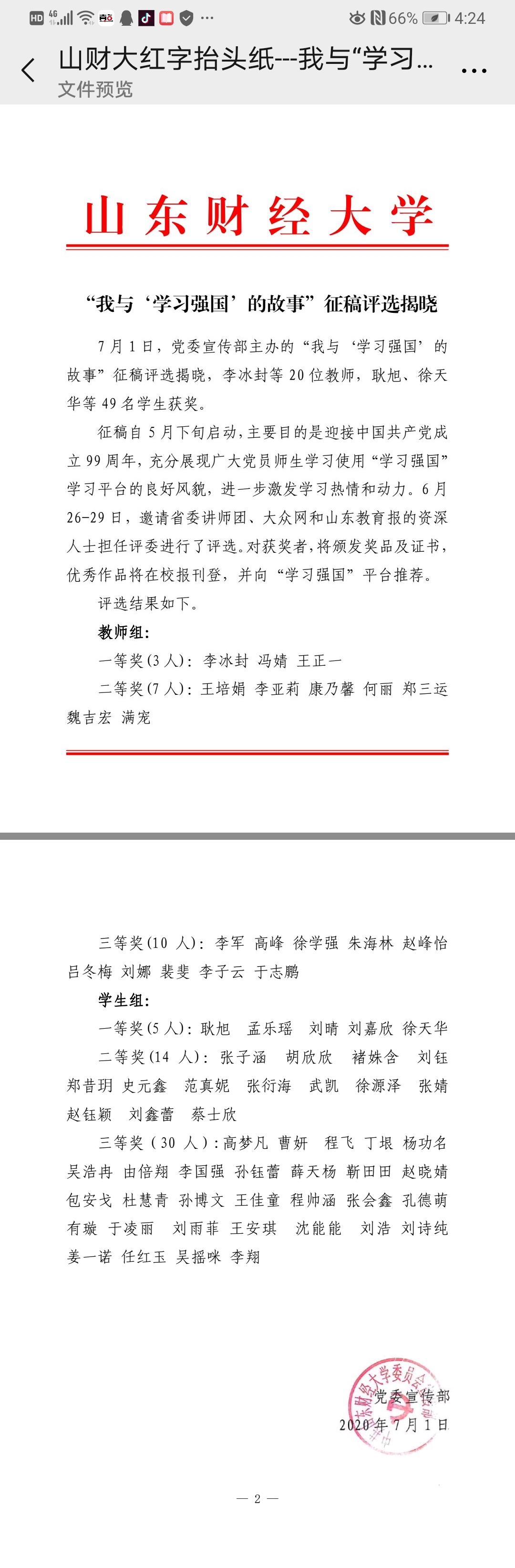 (通讯员 李冰封)近日,学校党委宣传部主办的“我与‘学习强国’的故事”征稿评选落下帷幕。教师组全校20名教师获奖,其中一等奖3名,二等奖7名,三等奖10名。我院李冰封老师喜获一等奖,高峰、裴斐、朱海林三位教师喜获三等奖。