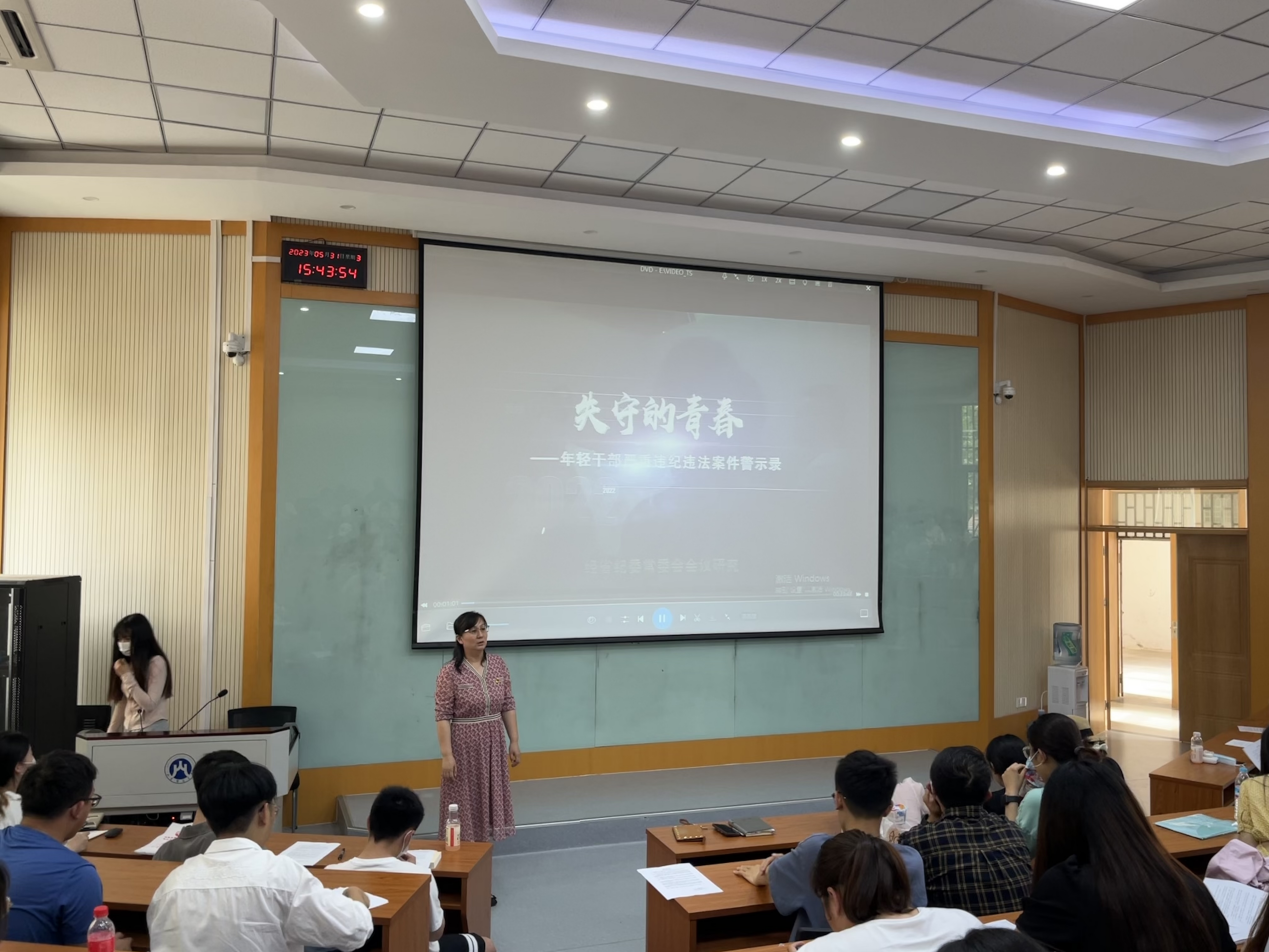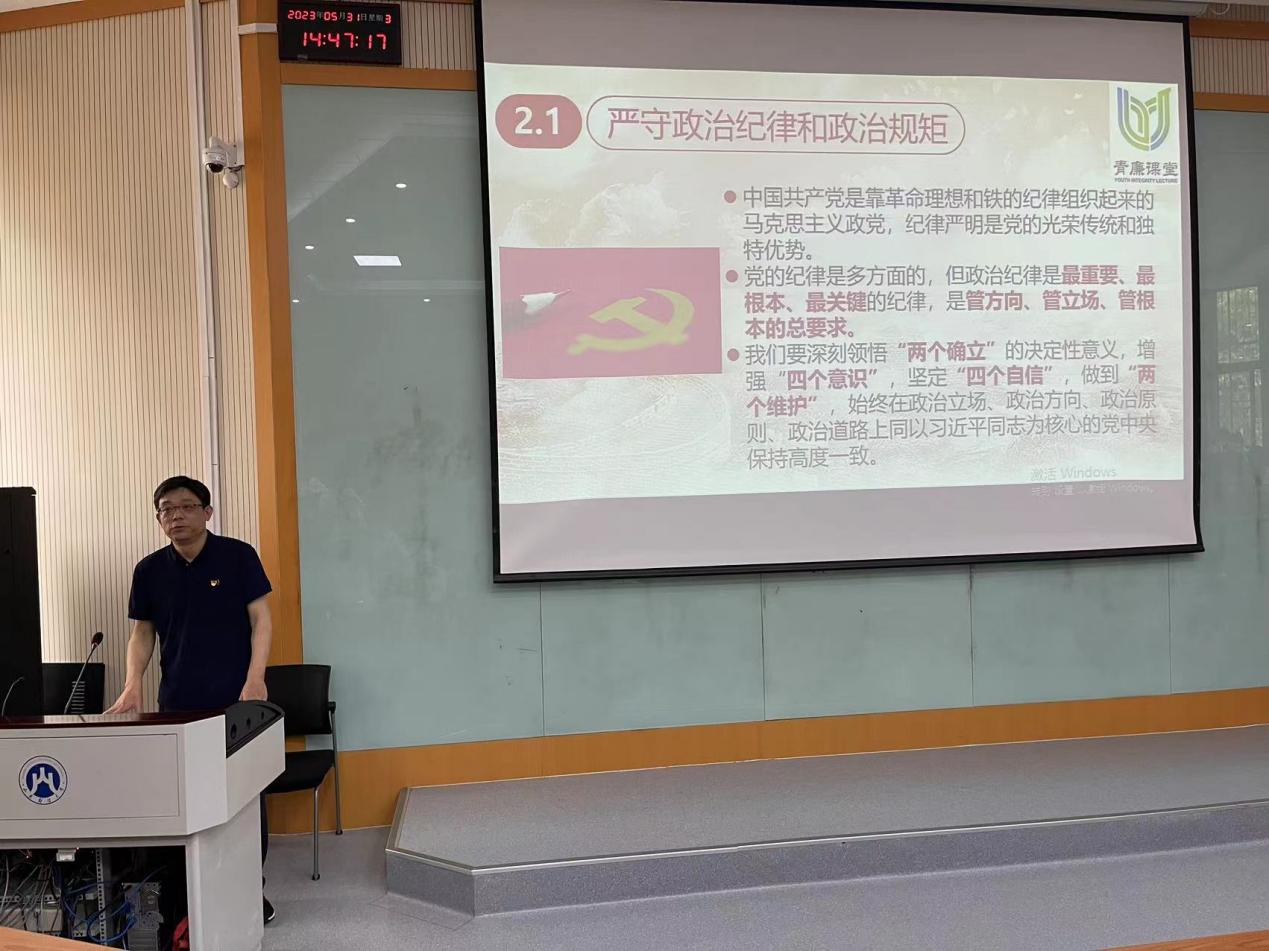学院开展“青廉课堂”——2023届毕业生党员廉政教育党课。学院党委书记姜伟以《锤炼党性,廉洁自律》为主题,深入阐释了全面从严治党的重大意义,并结合典型案例,深刻剖析了年轻干部违纪违法的特点和原因,警示同学要勤弹“思想尘”、多思“贪欲害”、常破“心中贼”、慎独慎微,知敬畏、存戒心、守底线,要树立正确的人生观、权力观和道德观,增强法律意识,坚定理想信念,牢记初心使命,扣好廉洁从业的“第一粒扣子”。他指出,“青廉课堂”是提高毕业生党员廉洁自律意识的重要举措,希望同学们坚定理想信念,坚定不移听党话,跟党走,筑牢廉洁从业思想道德防线,提高拒腐防变和自我保护能力。