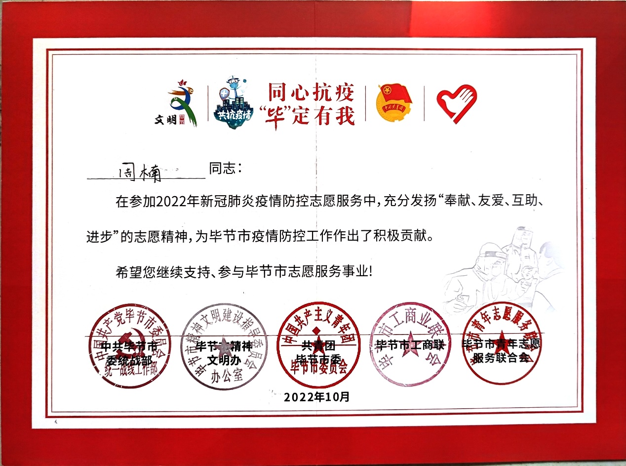 大四时,周楠婉拒了多家待遇优厚的公司邀约,放弃了申请推免读研的资格,毅然报名参加学校第24届研究生支教团。2022年7月18日,周楠前往六曲河镇腾龙社区为当地留守儿童组织开展“三点半课堂”等一系列课后辅导活动,被推选为六曲河镇初级中学“三生教育”种子教师,被聘任为赫章县“春晖使者”,并设立“春晖筑梦”助学金,每年定向捐款3000元建设乡村教育。