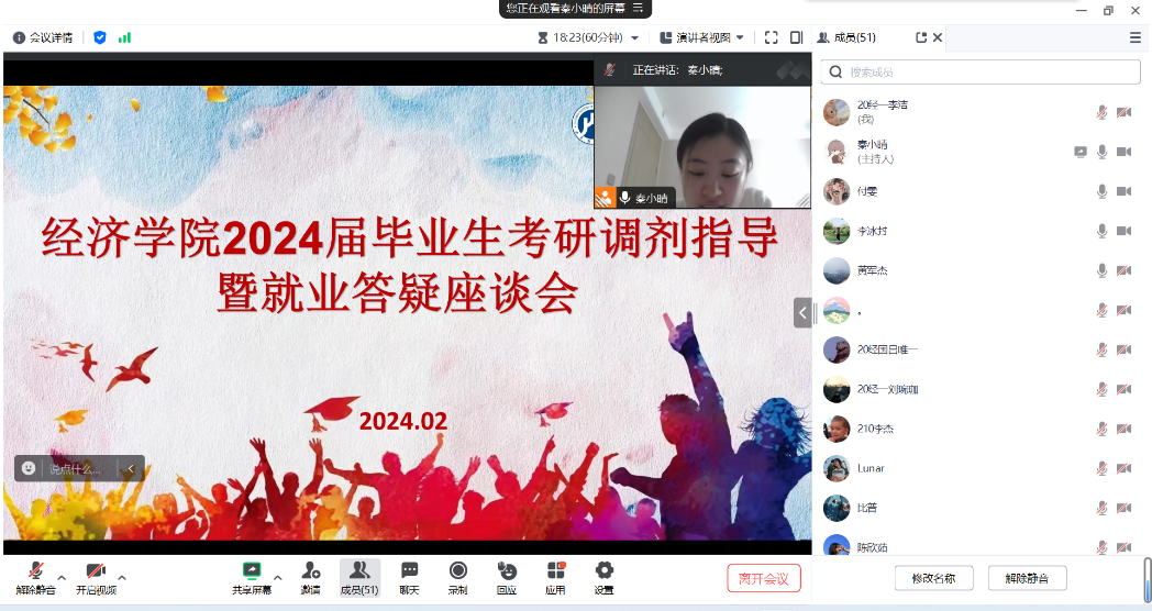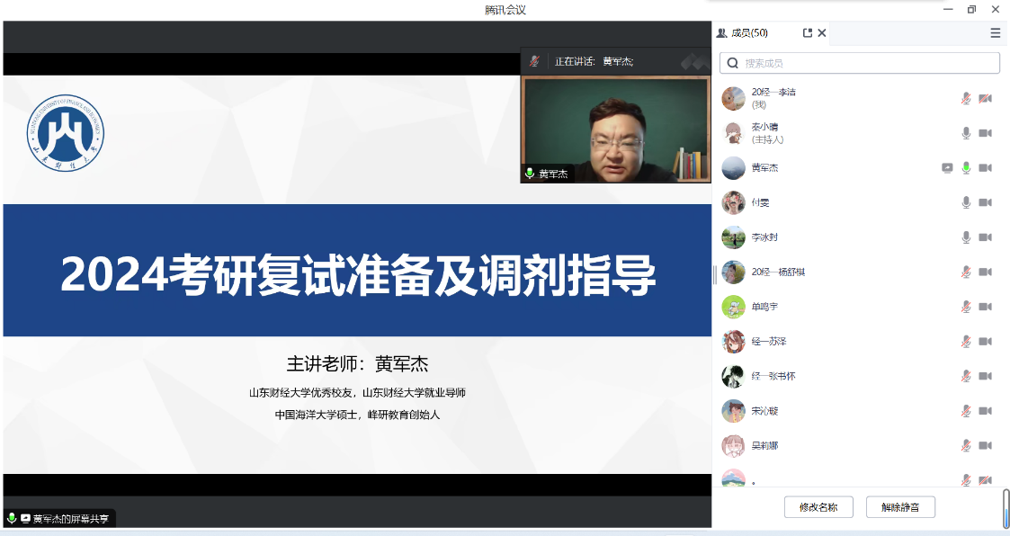 为进一步推进2024届毕业生就业工作,做好考研复试、调剂指导工作,2月21日上午,我院于线上召开2024届毕业生考研调剂指导暨就业答疑座谈会,此次座谈会面向大四毕业生,特邀太阳成集团tyc234cc校友、峰研教育创始人黄军杰为学生们作考研复试和调剂工作指导,院党委副书记李冰封出席会议,院团委书记付雯和辅导员秦小晴参加会议,并分别为毕业生讲解毕业前的注意事项以及就学生提出的就业相关问题答疑解惑,会议由秦小晴主持。