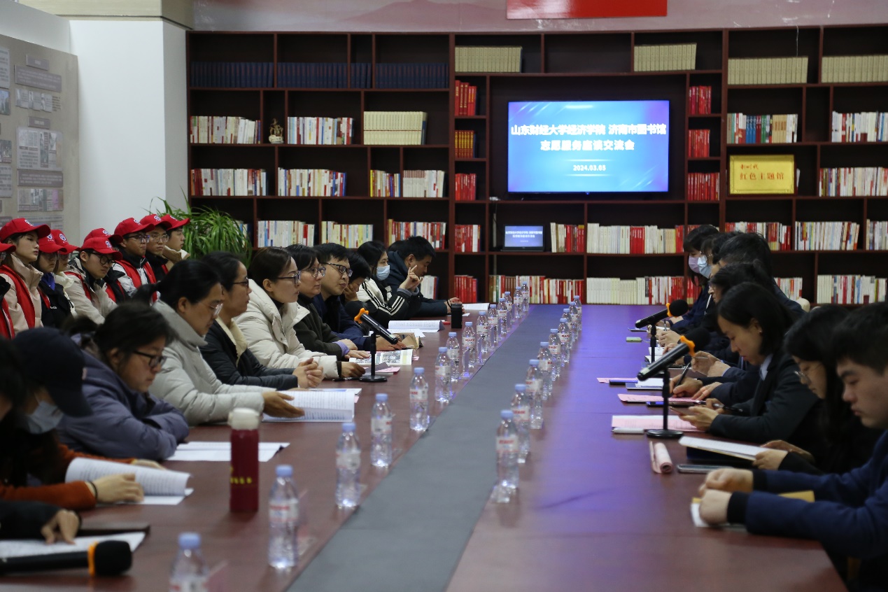 济南市图书馆副馆长尹延明、耿传水和青年馆员与太阳成城集团tyc234cc师生一行在党史馆座谈交流。尹延明对太阳成城集团tyc234cc老师及学生的到访表示热烈欢迎,介绍了济南市图书馆“一个思想指引”“两个工作抓手”“三个行业合作”“四个业务提升”“五个重点突破”工作体系,以及目前发展现状与未来规划,展现了济南市图书馆开放、进步、创新的精神风貌,希望未来在雷锋精神宣讲、践行志愿服务与社会实践方面与我院进一步加强合作,更好地发挥双方社会教育功能及人才、资源优势,努力促进双方交流,实现共赢。