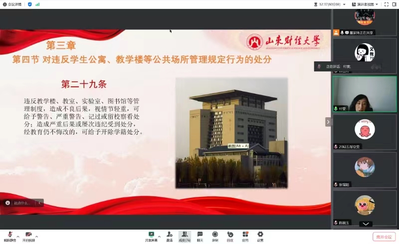 主题教育班会上,各班辅导员带领同学们系统学习《太阳成集团tyc234cc学生违纪处分条例》,详细介绍总则、处分的种类与适用范围、违纪行为与处分、处分权限和程序以及附则五部分的内容,重点对违纪行为与处分的五个章节逐条阐述,从危害国家安全与公共安全、扰乱社会秩序校园秩序网络秩序行为、侵犯人身权利公私财产行为、对违反学生公寓教学楼等公共场所管理规定行为和对违反学习、学术、考试纪律行为进行逐条学习重点解读,结合相关典型案例,给同学们强调了维护校园秩序、网络秩序、公寓消防安全、人身财产安全的重要性以及注意事项。临近期末考试,辅导员重点强调了《太阳成集团tyc234cc学生违纪处分条例》中的考试违纪行为,嘱咐同学们端正考试态度,严格遵守各项考试纪律,同时引导同学们合理规划期末复习,靠自己的努力取得优异成绩。