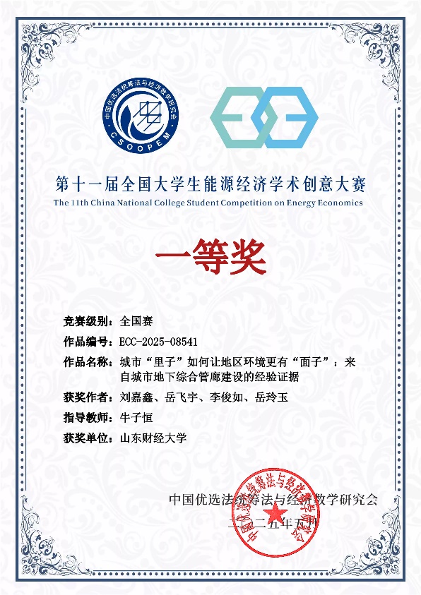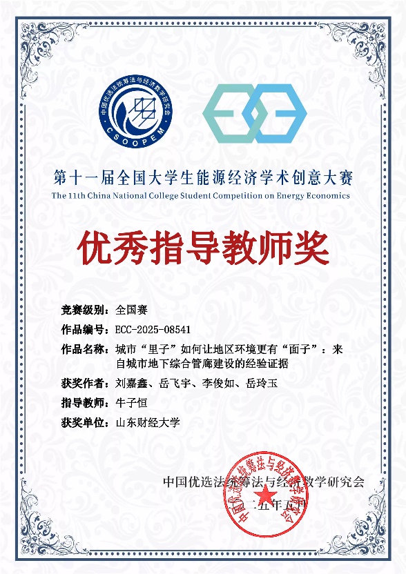 5月23日-25日,第十一届全国大学生能源经济学术创意大赛总决赛落下帷幕。我院学子获得国家级一等奖1项,三等奖2项。其中,由我院教师牛子恒指导,2023级经济学专业本科生刘嘉鑫作为项目负责人的作品《城市“里子”如何让地区环境更有“面子”:来自城市地下综合管廊建设的经验证据》进入本科组全国总决赛,并获全国一等奖,牛子恒获得优秀指导教师奖,为我校在该赛事上增添了一份重要荣誉。