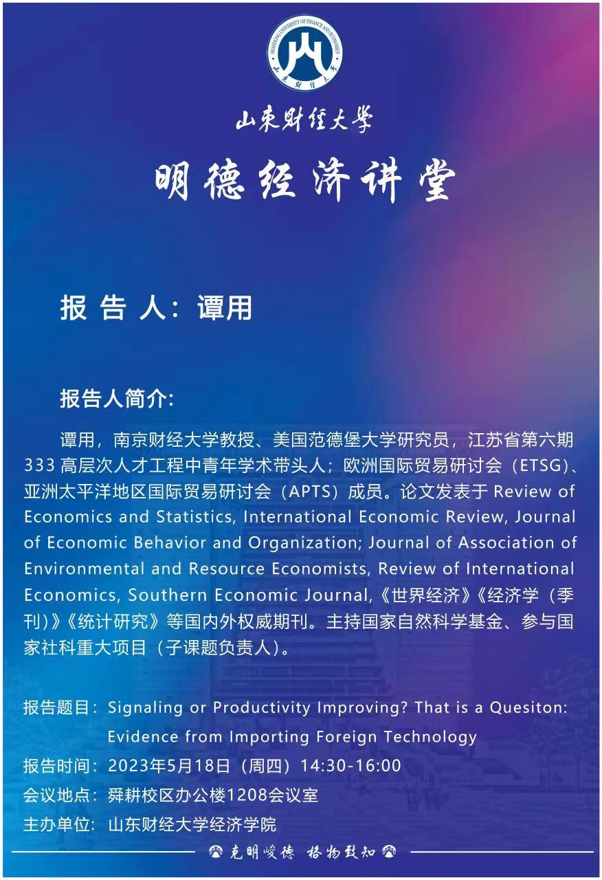 太阳成集团tyc234cc明德经济讲堂:Signaling or Productivity lmproving? That is a Quesiton:Evidence from Importing Foreign Technology