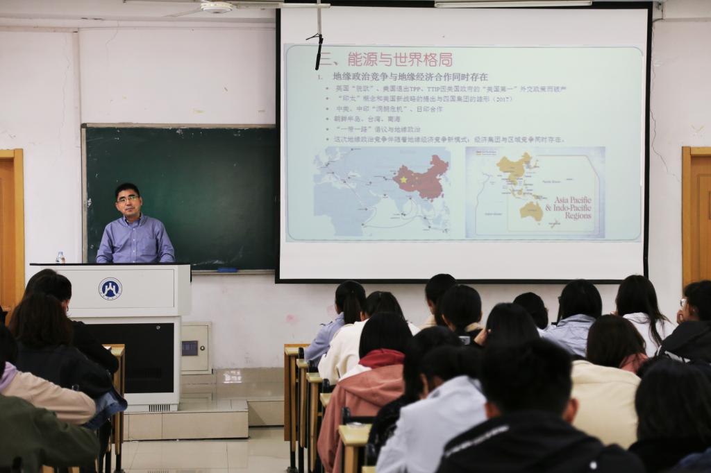 郭学堂教授以“能源、地缘政治经济与世界格局”为题,详细地介绍了能源通过地缘经济对世界格局进行重塑的相关内容。首先,郭教授以“全球能源市场新变化”为例展开讲座内容,详细解读能源、能源地缘经济以及能源安全等关键词的含义,分析了能源地理分布的影响、国家外交政策的能源地理表现以及特定形势下的政治和军事行为等内容。随后,郭教授从地缘经济学的角度阐述了能源地缘政治经济结构和“海上丝绸之路”倡议对周边国家的影响等相关问题。最后,郭教授通过地缘政治竞争与地缘经济合作分析了能源安全、能源结构对世界格局的影响。
