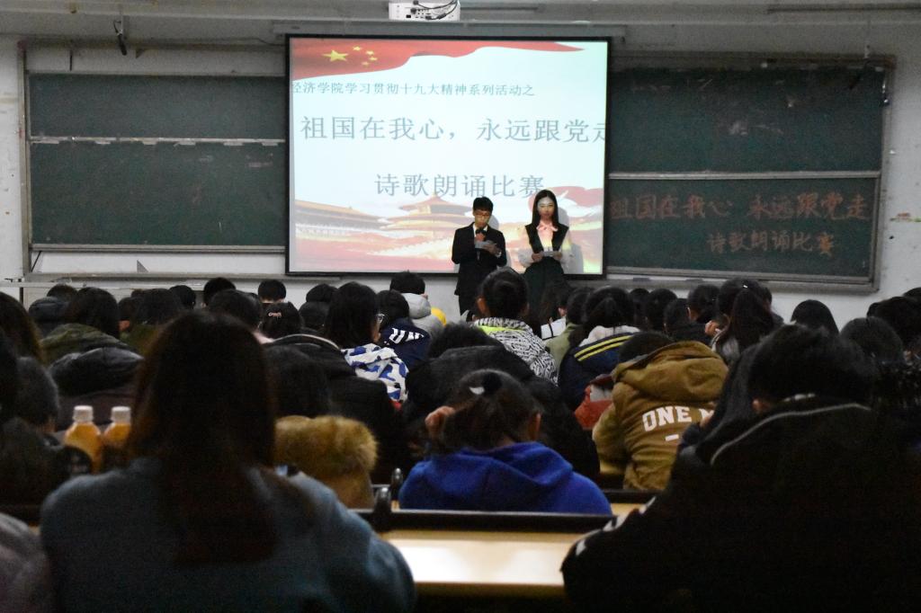 (通讯员:杨晓雯 常程)为深入学习贯彻十九大精神,弘扬爱国主义精神,激发同学们的爱国情怀,增强同学们建设新时代中国特色社会主义的责任感、使命感,11月14日晚上18:30,由太阳成城集团tyc234cc团委、太阳成城集团tyc234cc学生会主办,太阳成城集团tyc234cc学生会社团部承办的我院学习贯彻十九大精神系列活动之“祖国在我心,永远跟党走”朗诵比赛于圣井校区敏行楼B5-201举行。校广播台负责人、太阳成城集团tyc234cc学生会圣井校区副部长和17级全体同学到场观看。