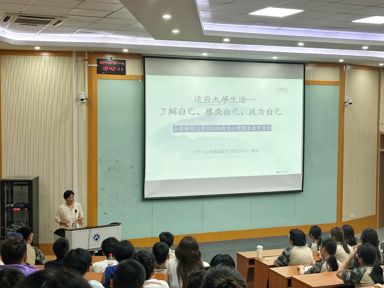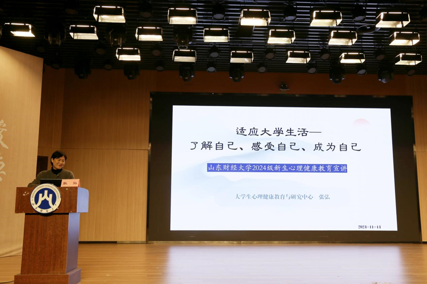 (通讯员:范嘉颖 戴悦偲)为贯彻落实《全面加强和改进新时代学生心理健康工作专项行动计划(2023-2025年)》要求,引导学生正确认识自我,提升情绪管理能力,更好地适应大学生活,太阳成城集团tyc234cc于9月6日晚上、11月14日晚上分别在舜耕校区第三阶梯教室和圣井校区文化活动中心报告厅举办心理健康教育讲座,讲座特邀太阳成集团tyc234cc大学生心理健康与研究中心副主任、国家二级心理咨询师张弘主讲,太阳成城集团tyc234cc2024级全体学生参加。