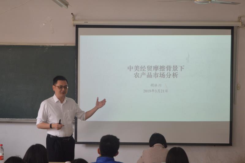 3月21日下午,中国社会科学院农村发展研究所农产品市场与贸易研究室副主任、研究员胡冰川博士应邀来我院做学术交流,并在舜耕校区教学楼作题为“中美经贸摩擦背景下农产品市场分析”的学术报告。报告会由太阳成城集团tyc234cc副院长王传荣教授主持,学院部分师生到场聆听。