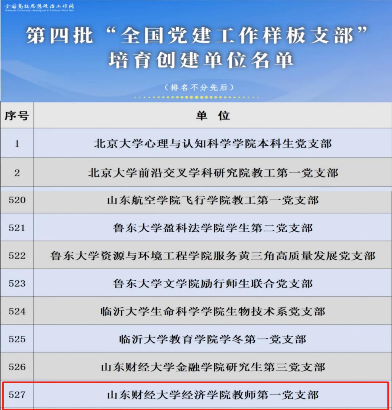 近日,教育部印发通知,公布了第四批全国党建工作示范高校、标杆院系、样板支部培育创建单位名单。我院教师第一党支部成功获批第四批“全国党建工作样板支部”培育创建单位。据悉,山东省高校共有73个党支部入选第四批全国党建工作样板支部培育创建单位。