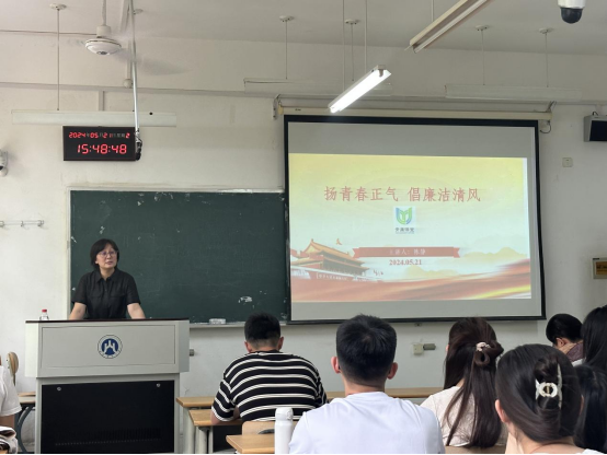 陈静以“扬青春正气,倡廉洁清风”为主题,从“扬信念之帆”、“存敬畏之念”、“怀感恩之心”三个章节为同学们进行了深入浅出的讲解,阐述了共产党人保持廉洁本色的崇高信仰和坚定意志,并结合具体案例进行剖析,引导同学们自觉学习党的纪律规矩,敬畏法律法规,严守原则底线,时刻保持清醒和坚定。