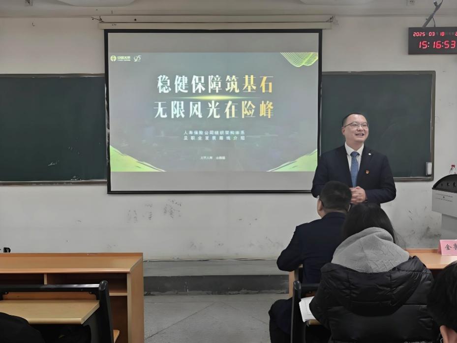 金鲁强以“稳健保障筑基石,无限风光在险峰”为主题,介绍人寿保险公司组织架构体系及职业发展路线。他首先从保险公司概况和经营模式入手,介绍了保险公司的体制和运营模式,并分析了太平保险“专注国际级优质资源”的投资渠道优势;他进一步阐述了人寿保险公司的组织架构体系及员工职业发展路线,明确了保险公司未来组织架构的发展趋势,并为同学们展示了“之”字型人才职业发展路径的全新视角;他回顾了中国太平人寿保险有限公司的品牌历史与发展战略,展示了中国太平在“荣耀与挑战共舞”的发展道路上所取得的成就。