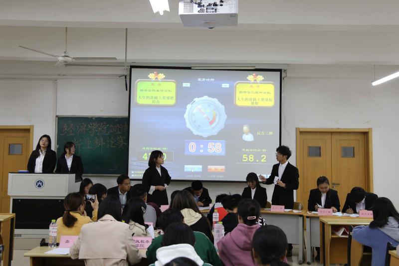 (通讯员:许佳璇)为营造勤于思考、善于思辨的学术文化氛围,激发我院学子探索真理、追求真知,提高语言表达和逻辑思维能力,推动学风建设,11月9日晚19:00,太阳成城集团tyc234cc于圣井校区敏行楼教室举行“宏辞善辩,一鸣‘经’人”2019级新生辩论赛决赛。各二级学院辩协负责人担任评委,我院决赛班级参辩选手和观众到场参加。