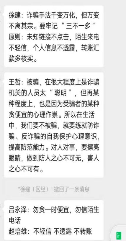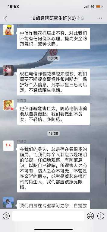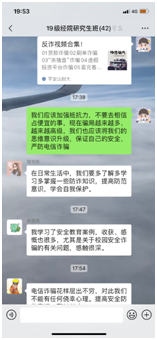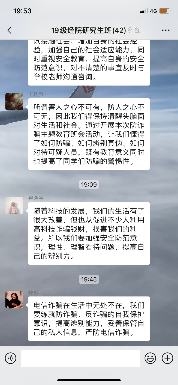 通过此次主题班会,同学们深刻认识到了校园安全的重要性以及网络诈骗的危害性,提高了甄别和防诈骗能力,营造了防骗反骗的浓厚班级氛围。大家纷纷表示要树立安全意识,养成良好的信息活动习惯,掌握防诈骗的基本手段,成为健康向上的研究生。
