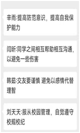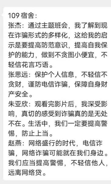 最后同学们就严防网络电信诈骗、保护自身财产、维护校园安全逐一发表了感想。